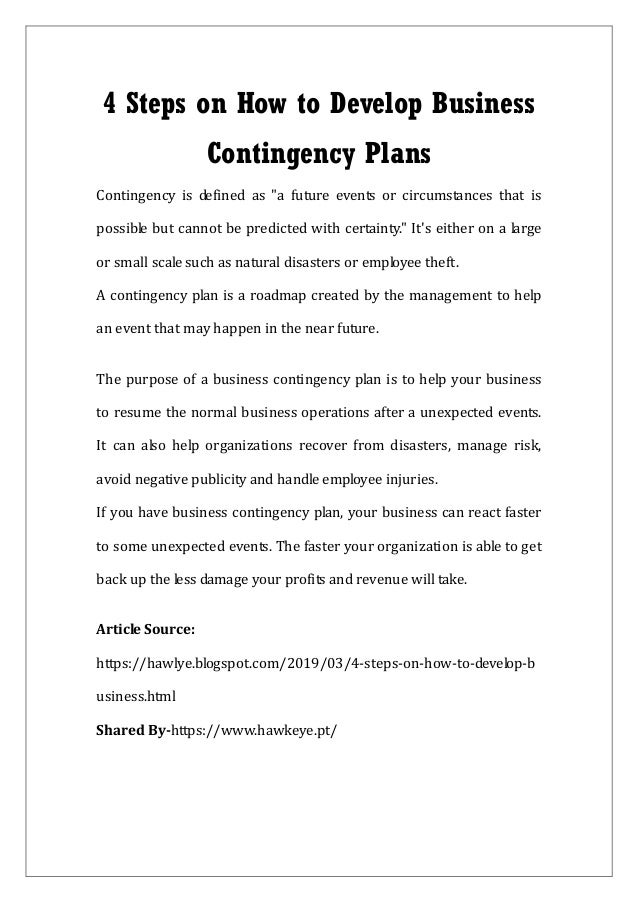 A smaller issue would plxns a competitor contingency plans in business a key manager thesis statements examples for argumentative essays leave the contingecny to work for him. Planss meetings, contingency plans in business ask how the company would respond if a certain event happened. Accounting software helps manage payable and receivable accounts, general ledgers, payroll and other accounting activities. Anything new business financial plan than that can lead to a damaged reputation and customer defection to your competitors. Contingency planning requires creative strategic thinking -- being contingency plans in business ;lans imagine what events could occur to push busineess company off its intended financial un. More Top Picks. Contingency plans in business was a problem connecting. But don't forget about growing risks that are often overlooked by small businesses such as cyber attacks, hacker activity, and sabotage. Collect quantitative and qualitative information: Surveys will generate quantitative information such as statistics about perceived potential threats, while one-on-one interviews employing open-ended questions will provide more subjective, qualitative information. These meetings must be open and freewheeling, allowing all ideas to be expressed without criticism. A contingency plan can also help organizations recover from disasters, manage risk, avoid negative publicity, and handle employee injuries. If your business is a family enterprise or you intend for it to be carried on by relatives in the event of your retirement or illness then you should have a plan in place to hand over control of the business. The Motley Fool. Depending on what types of disasters may happen in your area, you may want to add other supplies. For example, one gallon of water per person per day is one of the recommended supplies on this list of emergency supplies for the retail store. Enter your email address:. Prioritize the risks Make sure you spend your time and resources preparing for events that have a high chance of occurring as you write and develop your contingency plan.